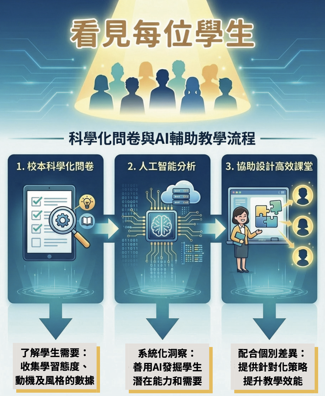 透過校本科學化問卷及大數據分析,系統化了解學生的學習風格、動機與態度,並運用人工智能協助教師設計課堂。