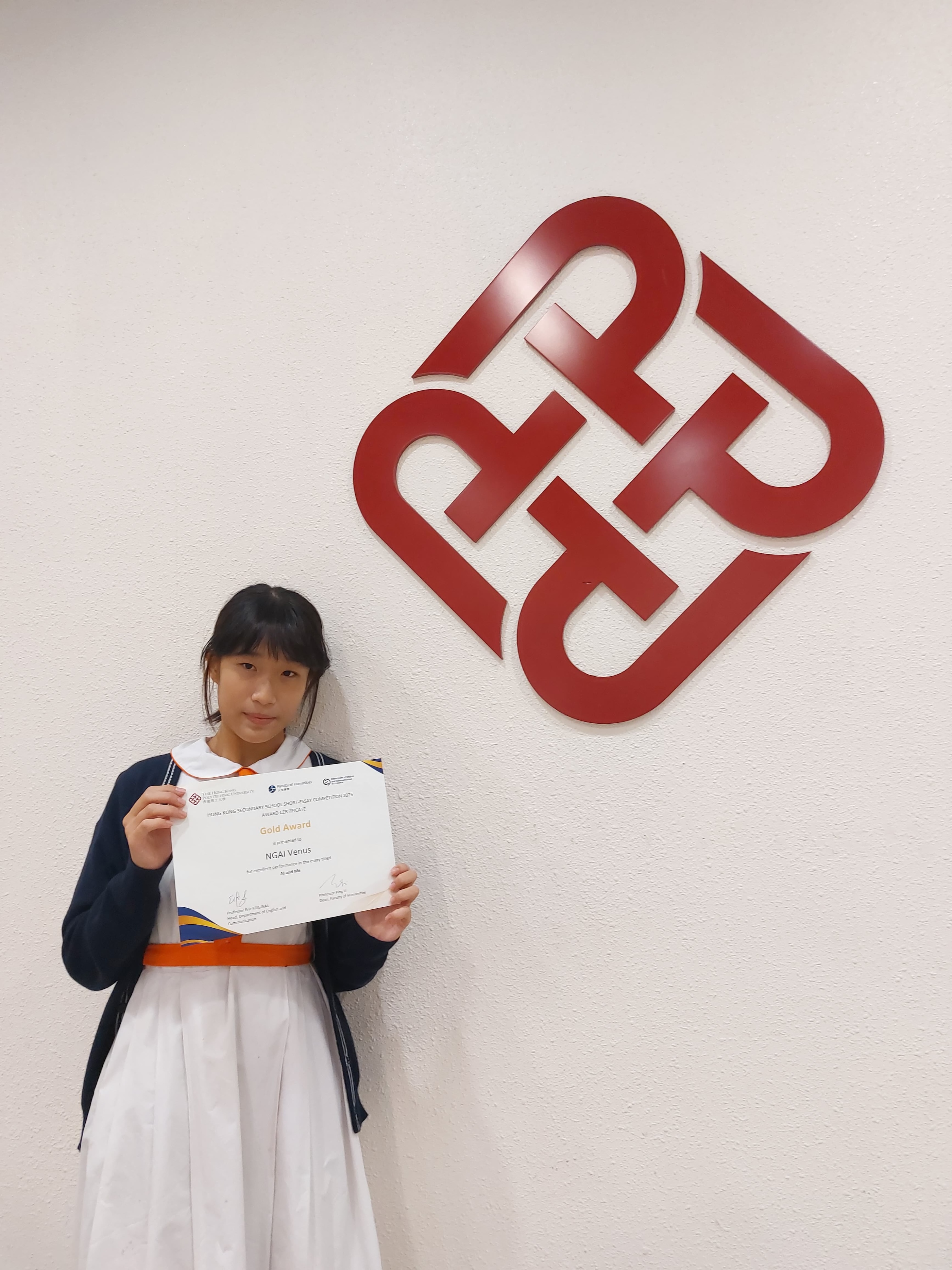 Our student, Ngai Ngai, has won the Gold Award in the ”Hong Kong Secondary School Short-Essay Competition 2025,“ organized by The Hong Kong Polytechnic University. She attended the Award Presentation Ceremony on 19 September 2025. Her winning piece will be featured in the upcoming anthology, AI and Me: Winning Essays from the Hong Kong Secondary School Short-Essay Competition 2025. The book will be published by the PolyU Press with an official ISBN registration and will be accessible to the public through the Hong Kong Public Libraries.